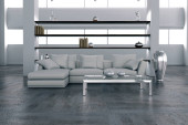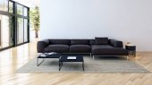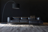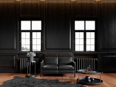 Czarne minimalistyczne wnętrze z sofą i stołem kawowym.