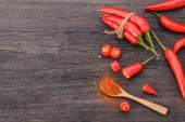 Drewniana deska do krojenia z pieprzem w drewnianej łyżeczce i czerwone chili szalotki czosnek bazylia kolendra liści pomidory rozłożone z worków leżały na blat stołu - widok z góry.