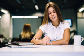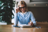 Kaukaska brunetka student pisząc informacje edukacyjne w notatniku spędzać czas na przygotowanie egzaminu, inteligentny blogger młodzieńczy tworzenie pomysłów na publikację notatek notatki w podręczniku
