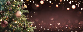 Vintage choinka z retro ozdoba i złoty błyszczący brokat w nieostrym tle