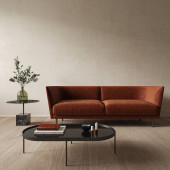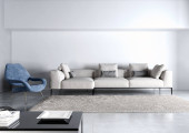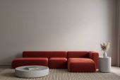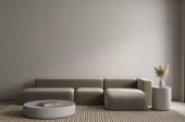 Szare minimalistyczne wnętrze z marmurowym stołem kawowym i sofą.