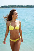 Szczęśliwa kobieta w bikini spacery na plaży