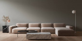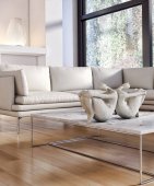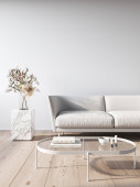 Nowoczesne minimalistyczne białe wnętrze z pomarańczową sofą i stołem kawowym.