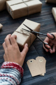 Dłonie kobiety w pullover koperty świąteczne pudełko ozdobione papier kraft