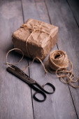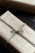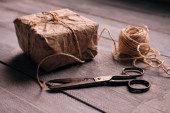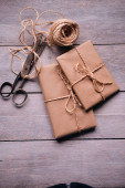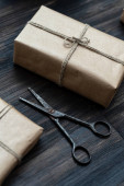 Świąteczne pudełko zapakowane w papier rzemieślniczy nad drewnianym stołem przygotowanym do świętowania świątecznego sezonu