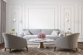 Zdjęcie "Nowoczesne minimalizm białe wnętrze z kanapą, kanapą, palmami i stolikami kawowymi." może być wykorzystywane do celów osobistych i komercyjnych zgodnie z warunkami zakupionej licencji Royalty-free. Obraz jest dostępny do pobrania w jakości wysokiej rozdzielczości do 5760x3840.