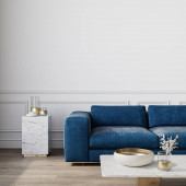Nowoczesne minimalizm białe wnętrze z kanapą, kanapą, palmami i stolikami kawowymi.