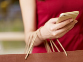 Blank copyspace do reklamy na ekranie smartfona posiadanego przez dorosłą modelkę niosącą torby na zakupy jako nowoczesną koncepcję konsumpcjonizmu odizolowaną na białym tle