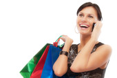Uśmiechnięta dorosła modelka rozmawiająca przez telefon komórkowy, niosąca kolorowe torby na zakupy, jako nowoczesną koncepcję konsumpcjonizmu mody odizolowaną na białym tle studia