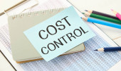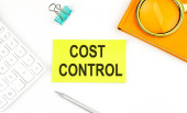 COST CONTROL - słowa na białym arkuszu z klipsami na żółtym tle z kalkulatorem, guzikami i ołówkiem. Koncepcja biznesowa i finansowa