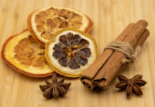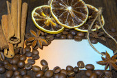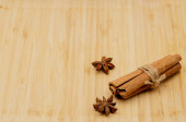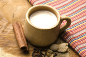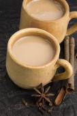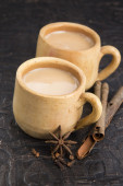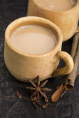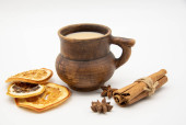 Brązowy gliniany kubek z napojem, cynamonem i anyżem na białym tle.