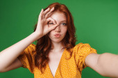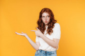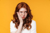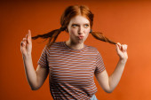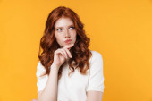 Obraz rudej myślącej dziewczyny trzymającej kciuki na szczęście odizolowane na żółtym tle