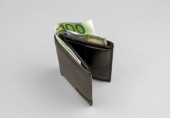 Skórzany czarny portfel z dolarem i banknotami euro na szarym tle