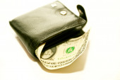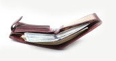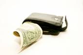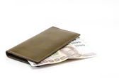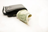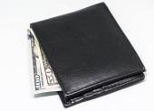 Skórzany czarny portfel z dolarem i banknotami euro na szarym tle