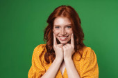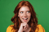 Obraz rudej radosnej dziewczyny trzymającej i wskazującej palcem na copyspace odizolowany na żółtym tle