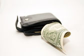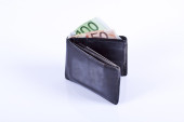 Skórzany czarny portfel z dolarem i banknotami euro na szarym tle