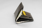 Skórzany czarny portfel męski za pieniądze i karty kredytowe na szarym tle