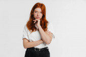 Obraz rudej pięknej dziewczyny pozowanie i patrząc na aparat izolowane na żółtym tle