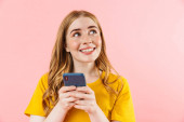Obraz rudej szczęśliwej dziewczyny uśmiecha się i za pomocą telefonu komórkowego izolowane na żółtym tle