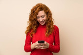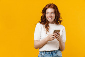 Obraz rudej szczęśliwej dziewczyny uśmiecha się i za pomocą telefonu komórkowego izolowane na żółtym tle