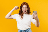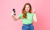 Obraz rudej radosnej dziewczyny gestykulującej znak pokoju podczas robienia selfie na komórce odizolowanej od żółtego tła