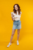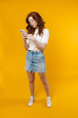 Zdjęcie "Obraz rudej radosnej dziewczyny gestykulującej znak pokoju podczas robienia selfie na komórce odizolowanej od żółtego tła" może być wykorzystywane do celów osobistych i komercyjnych zgodnie z warunkami zakupionej licencji Royalty-free. Obraz jest dostępny do pobrania w jakości wysokiej rozdzielczości do 5760x3840.