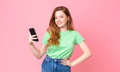 Wizerunek rudej radosnej dziewczyny uśmiechniętej podczas robienia selfie na komórce odizolowanej na żółtym tle