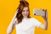 Obraz rudej szczęśliwej dziewczyny uśmiecha się i rozmawia przez telefon komórkowy odizolowany na żółtym tle