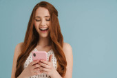 Zdjęcie "Obraz rudej szczęśliwej dziewczyny uśmiecha się i za pomocą telefonu komórkowego izolowane na żółtym tle" może być wykorzystywane do celów osobistych i komercyjnych zgodnie z warunkami zakupionej licencji Royalty-free. Obraz jest dostępny do pobrania w jakości wysokiej rozdzielczości do 5760x3840.