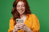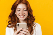 Obraz rudej szczęśliwej dziewczyny uśmiecha się i za pomocą telefonu komórkowego izolowane na żółtym tle