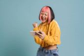 Obraz imbir skupiony dziewczyna pozowanie i za pomocą telefonu komórkowego izolowane na żółtym tle