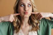 Zdjęcie "Wizerunek imbir myślenie dziewczyna co pocałunek usta i wskazując palce na jej policzki izolowane na zielonym tle" może być wykorzystywane do celów osobistych i komercyjnych zgodnie z warunkami zakupionej licencji Royalty-free. Obraz jest dostępny do pobrania w jakości wysokiej rozdzielczości do 5760x3840.