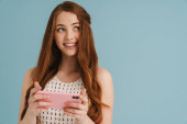 Obraz rudej szczęśliwej dziewczyny uśmiecha się i za pomocą telefonu komórkowego izolowane na zielonym tle