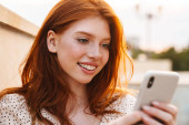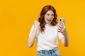 Zdjęcie "Obraz rudej szczęśliwej dziewczyny uśmiecha się i za pomocą telefonu komórkowego izolowane na zielonym tle" może być wykorzystywane do celów osobistych i komercyjnych zgodnie z warunkami zakupionej licencji Royalty-free. Obraz jest dostępny do pobrania w jakości wysokiej rozdzielczości do 5760x3840.