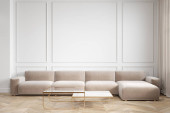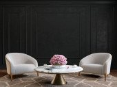 Klasyczne beżowe wnętrze z fotelem, stołem kawowym, kwiatami i listwami ściennymi.