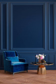 Zdjęcie "Klasyczne beżowe wnętrze z fotelem, stołem kawowym, kwiatami i listwami ściennymi." może być wykorzystywane do celów osobistych i komercyjnych zgodnie z warunkami zakupionej licencji Royalty-free. Obraz jest dostępny do pobrania w jakości wysokiej rozdzielczości do 5760x3840.