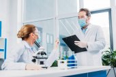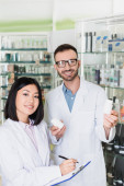 międzyrasowych farmaceutów w białych fartuchach oglądających schowki w aptece