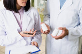 przycięty widok farmaceuty dając butelkę z tabletkami do klienta w aptece