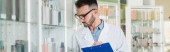 aptekarz w okularach i masce medycznej patrzący na kamerę w aptece