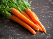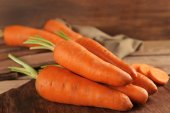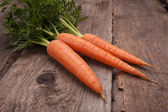 pęczek świeżej marchwi z zielonych liści drewniane tła.