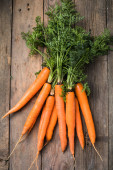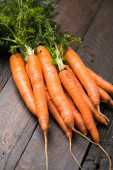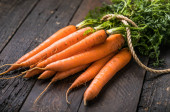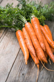 Świeże marchewki na rustykalnym tle. Zdrowa wegańska żywność warzywna.