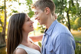 uśmiechnięta młoda para, patrząc na siebie w parku