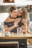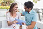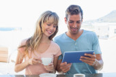 szczęśliwa para przy użyciu cyfrowych tabletki przy kawie