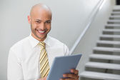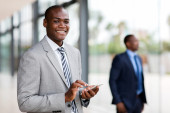 uśmiechający się biznesmen tekstem wiadomości z kolegami z biura