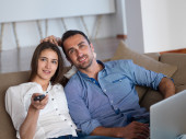 Zdjęcie "Młoda para oglądania telewizji na kanapie w salonie" może być wykorzystywane do celów osobistych i komercyjnych zgodnie z warunkami zakupionej licencji Royalty-free. Obraz jest dostępny do pobrania w jakości wysokiej rozdzielczości do 5760x3840.