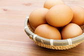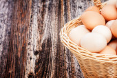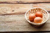 pęknięte jajka w wiklinowym talerzu na drewnianym stole. Zdjęcie poziome