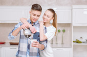 Mężczyzna patrzy na swoją małżonkę gotującą śniadanie