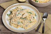 Domowej roboty kurczak Fettuccine Alfredo na białym talerzu na białym drewnianym tle, widok z góry. Płaskie ułożenie, nad głową, z góry.
