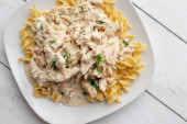 Zdjęcie "Domowej roboty kurczak Fettuccine Alfredo na białym talerzu, widok z boku. Zbliżenie." może być wykorzystywane do celów osobistych i komercyjnych zgodnie z warunkami zakupionej licencji Royalty-free. Obraz jest dostępny do pobrania w jakości wysokiej rozdzielczości do 5760x3840.