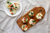 Zdjęcie "Domowej roboty Deviled Jaja z szczypiorkiem na wiejskiej drewnianej desce, widok z góry. Płaskie ułożenie, nad głową, z góry. " może być wykorzystywane do celów osobistych i komercyjnych zgodnie z warunkami zakupionej licencji Royalty-free. Obraz jest dostępny do pobrania w jakości wysokiej rozdzielczości do 5760x3840.